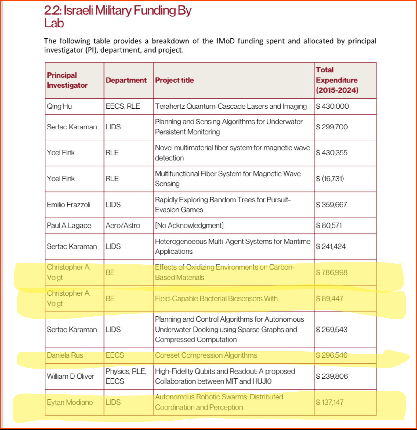 Since 2015, at least 9 PIs have taken money from the Israeli Ministry of Defense (I.M.o.D.). At least three of the projects are ongoing, two of them having been renewed during the recent phase of genocide. One additional PI, Dirk Englund, has also submitted a proposal to IMoD & IDF working on quantum computing, which is still awaiting approval. According to MIT’s research contract rules, the Israeli military has the right to “shape direction and objectives” as Direct Sponsors of these projects. This transaction is facilitated by the US DoD.