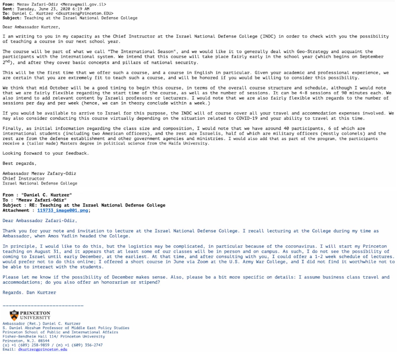 The N.J. Israel commission also hosts professors from several universities in New Jersey, along with having helped facilitate Memorandum of Understandings between Israeli universities and Rutgers, N.J.I.T., etc [-]. Interestingly, with respect to Princeton, Vivian Futran Fuhrman, another member of the N.J.-Israel Commission, works at Princeton’s Andlinger Center for Energy and the Environment as its Assistant Director for External Partnerships. [-]. Daniel C. Kurtzer, who was Ambassador to Israel under George W. Bush, is a member of the N.J.-Israel Commission, as well as the S. Daniel Abraham Professor of Middle East Policy Studies at Princeton [-]. Unsurprisingly, Kurtzer has also potentially gone to teach at the Israel National Defense College during the summer of 2021 as is documented in a Library-of-Leaks file [-]:
