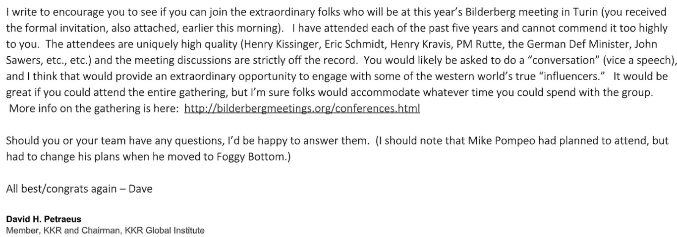 From 2008 onward, Schmidt began to attend the hyper exclusive annual Bilderberg meetings where he eventually met former Secretary of State and war criminal Henry Kissinger [now Schmidt occupies a position on its advisor board] [-]. An email from former General Petraeus, inviting a Gina Haspel [Director of C.I.A. 2018-2021 -] to the 2018 Bilderberg meeting, indicates their simultaneous presence at meetings [-]: